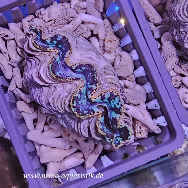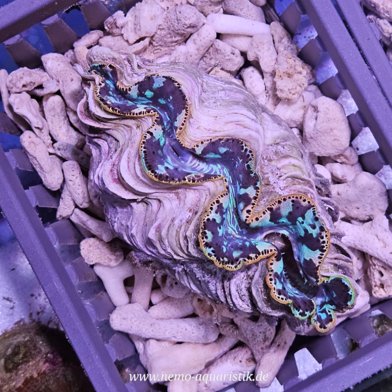 Die Tridacna gehört zur Familie der Riesenmuscheln. Sie ernährt sich über eingelagerte Mikroalgen in Sybiose und von Plankton und Staubfutter über Filtration. Nach dem Einsetzen verankert sie sich mit Hilfe ihrer Byssusfäden am Untergrund. Idealerweise sollte man die Muschel auf einen sogenannten Muschelhalter postieren. Dadurch kann man sie auch ohne Verletzungen an den Verankerungsfäden an einen anderen Ort befördern. Die Halterung kann einzeln aber auch in einer Gruppe stattfinden.Farbabweichungen sind möglich.