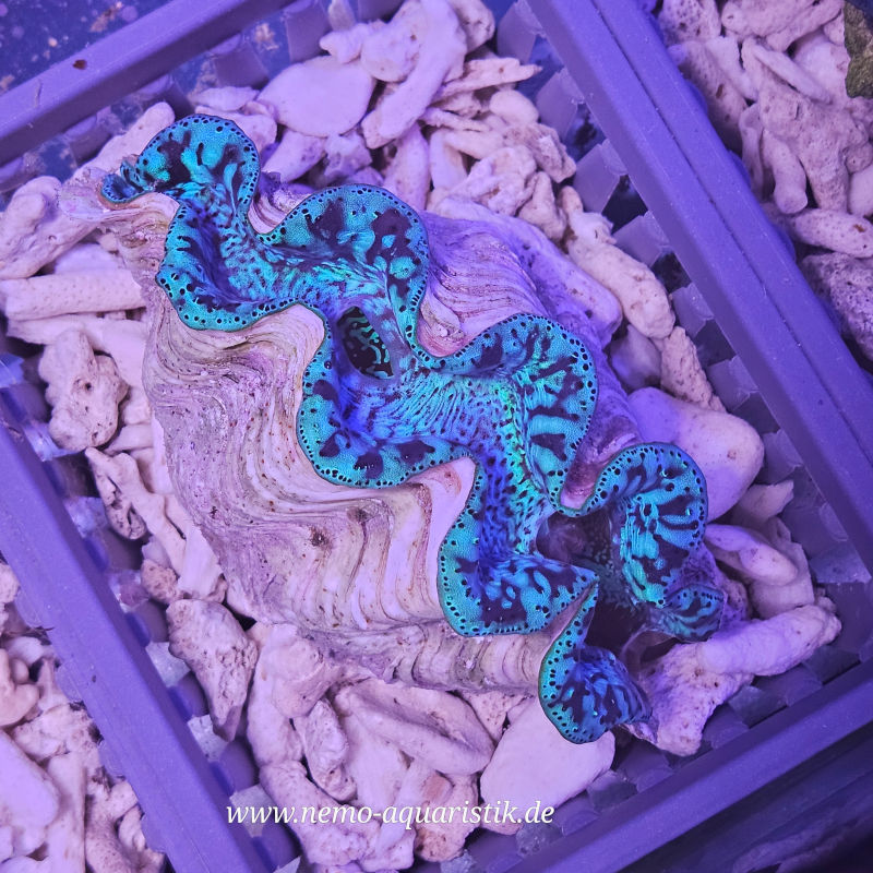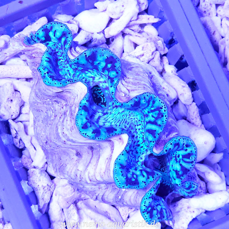 Die Tridacna gehört zur Familie der Riesenmuscheln. Sie ernährt sich über eingelagerte Mikroalgen in Sybiose und von Plankton und Staubfutter über Filtration. Nach dem Einsetzen verankert sie sich mit Hilfe ihrer Byssusfäden am Untergrund. Idealerweise sollte man die Muschel auf einen sogenannten Muschelhalter postieren. Dadurch kann man sie auch ohne Verletzungen an den Verankerungsfäden an einen anderen Ort befördern. Die Halterung kann einzeln aber auch in einer Gruppe stattfinden.Farbabweichungen sind möglich.